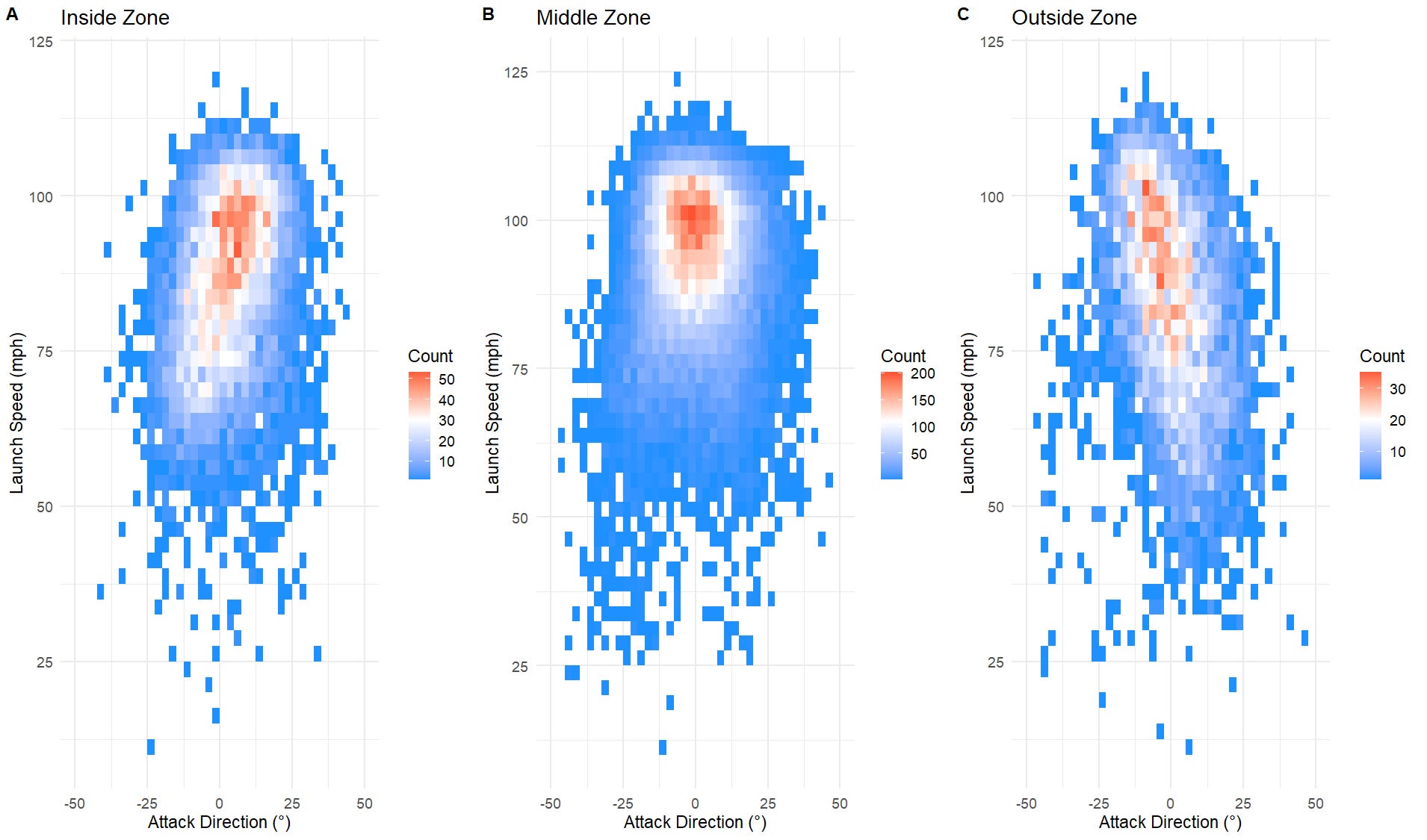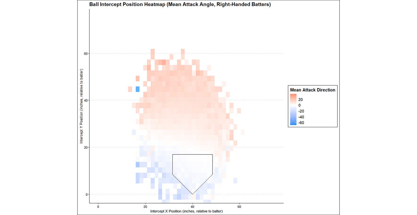 However, on pitches at the edges of the plate, the importance of matching attack direction becomes more pronounced. Inside pitches favor barrels turned toward the pull side, while outside pitches reward hitters who let the ball travel and drive it the other way.
