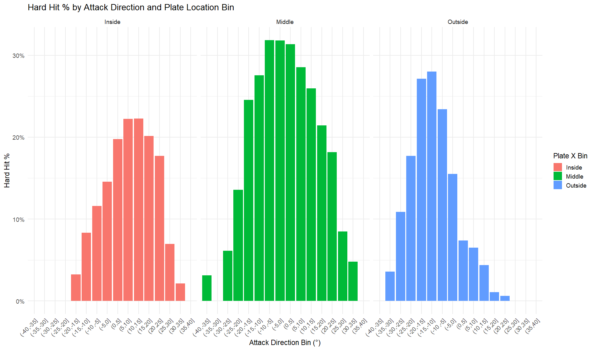 Let’s take a step back and look at all three lanes—outside, middle, and inside—and examine how hitters perform across them. Specifically, we’re looking at hard-hit rates on balls in play and comparing those to attack direction within each lane.