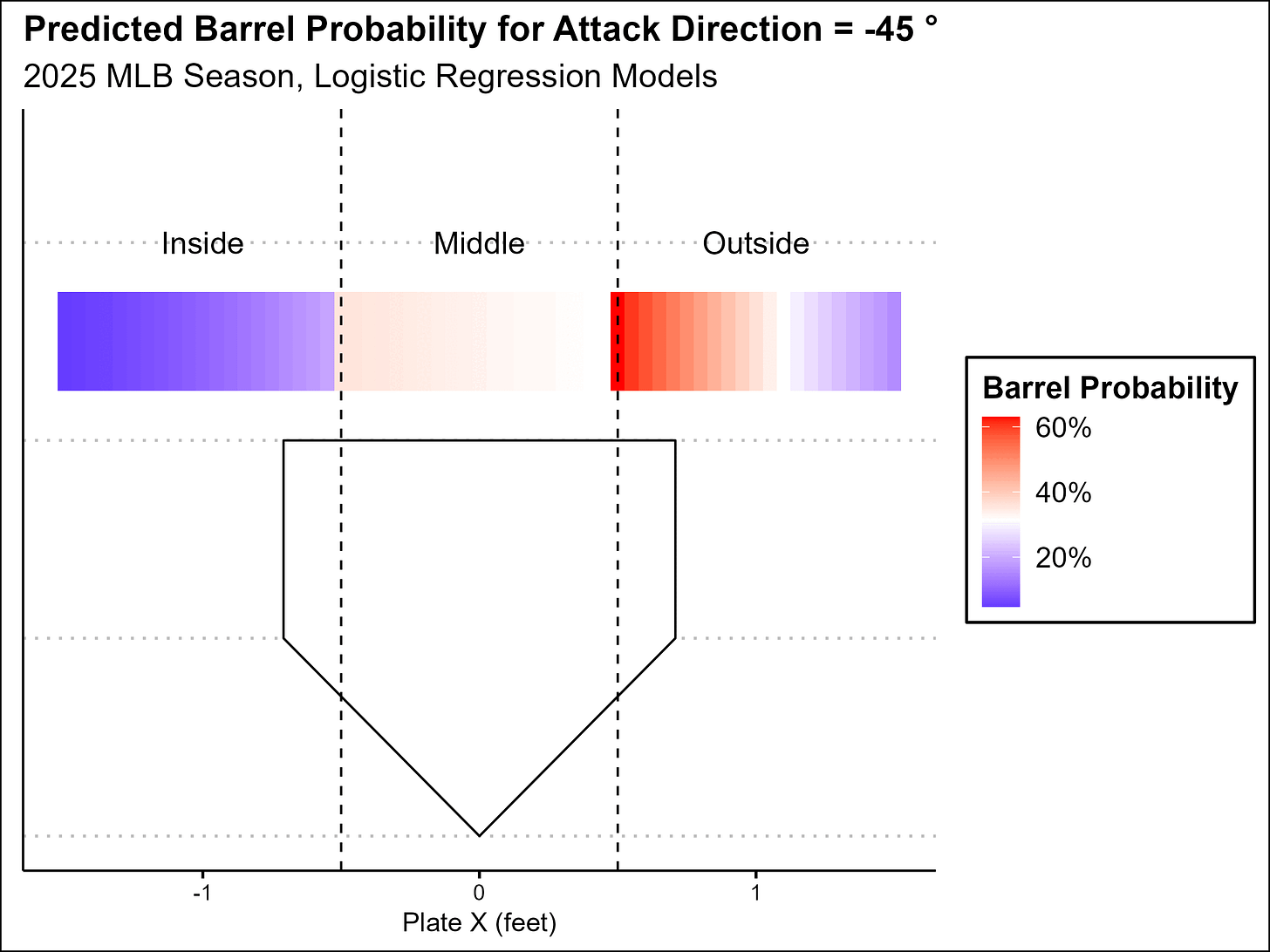 This effect becomes even clearer when we examine how barrel probabilities shift with changes in attack direction across the plate. The graphic below illustrates that as attack direction increases toward the pull side, barreling outside pitches becomes more difficult. Conversely, pitches over the inner half remain just as challenging to barrel when the attack direction faces the opposite field.