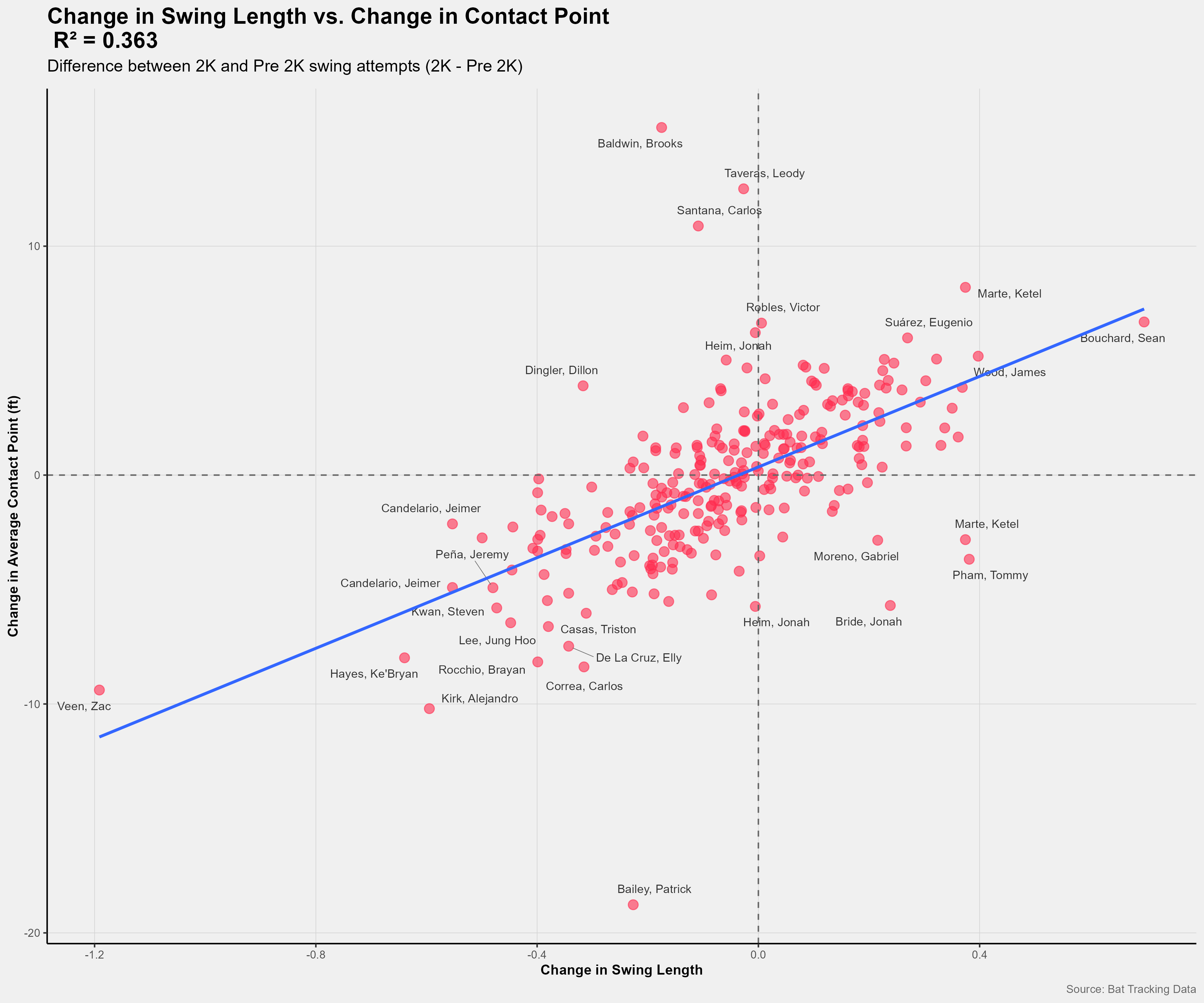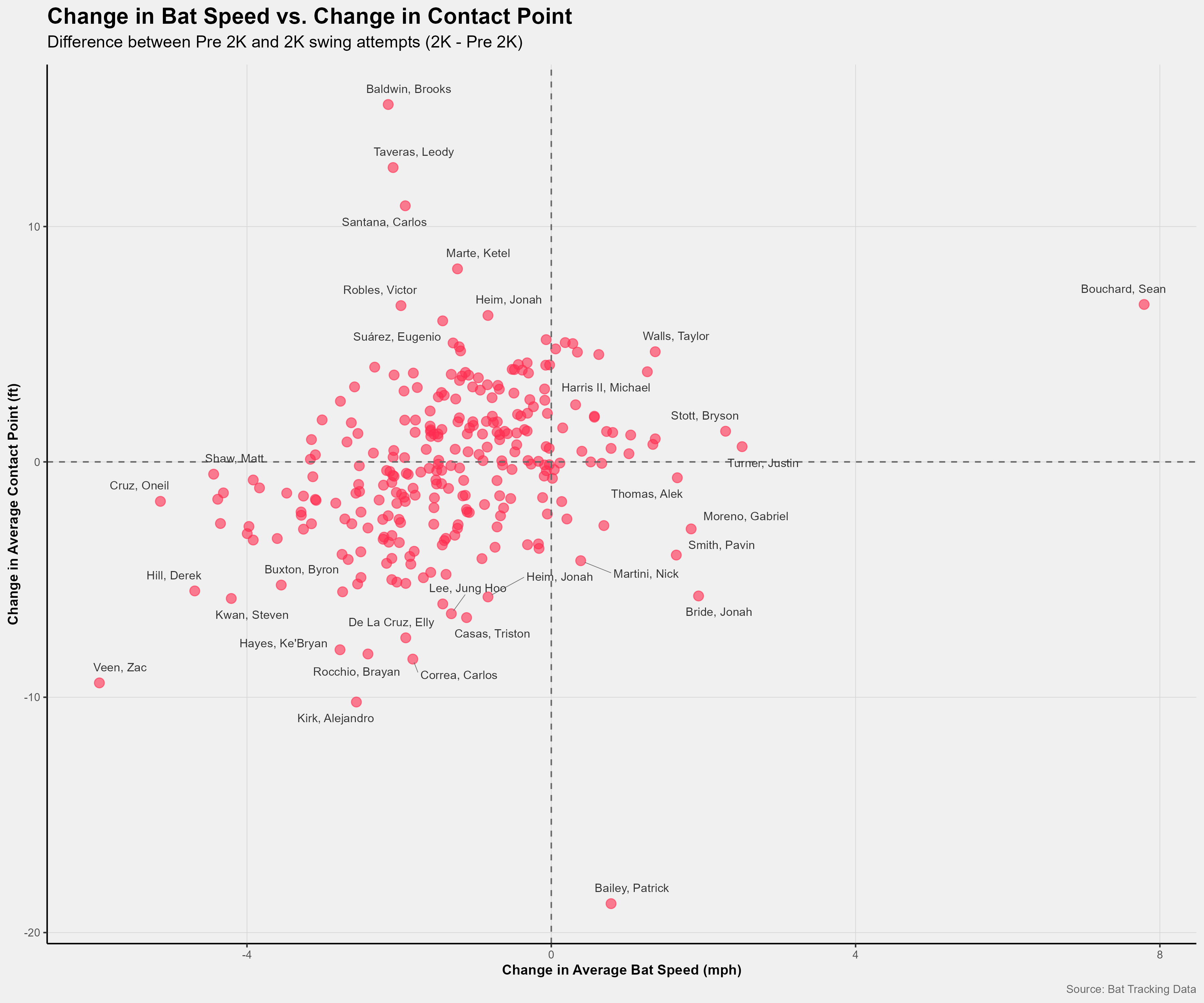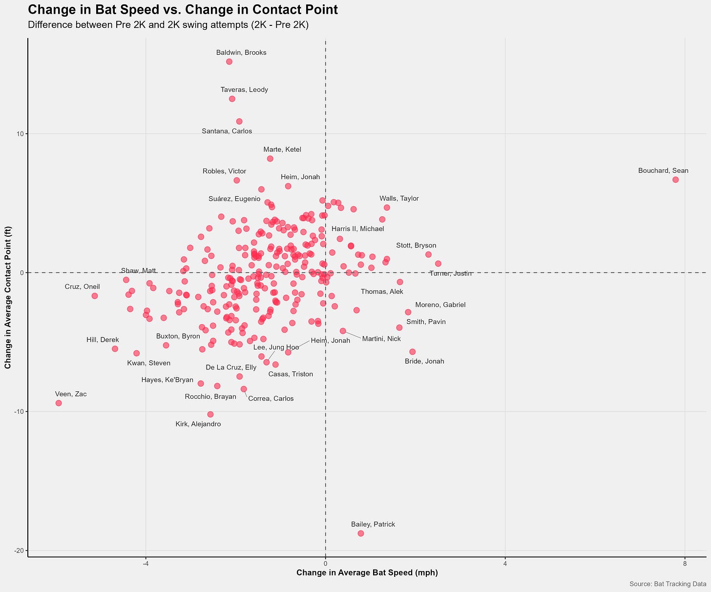 Again, this follows a fairly predictable pattern. As players enter two-strike counts, we would expect a drop in bat speed, paired with an intentional effort to move the contact point slightly deeper in the zone. The goal here is often simple: make contact and put the ball in play, even if it comes at the expense of power or ideal outcomes. The biggest takeaway is that most players deliberately dial down their bat speed in an attempt to be less aggressive and gain better control over the baseball. What’s more surprising, however, is that we don’t see a drastic shift in contact point across the board. While some hitters do adjust and move the ball deeper, others appear unable—or unwilling—to make that same adjustment. The result? Slower swings paired with nearly identical contact points, which can lead to less effective outcomes.