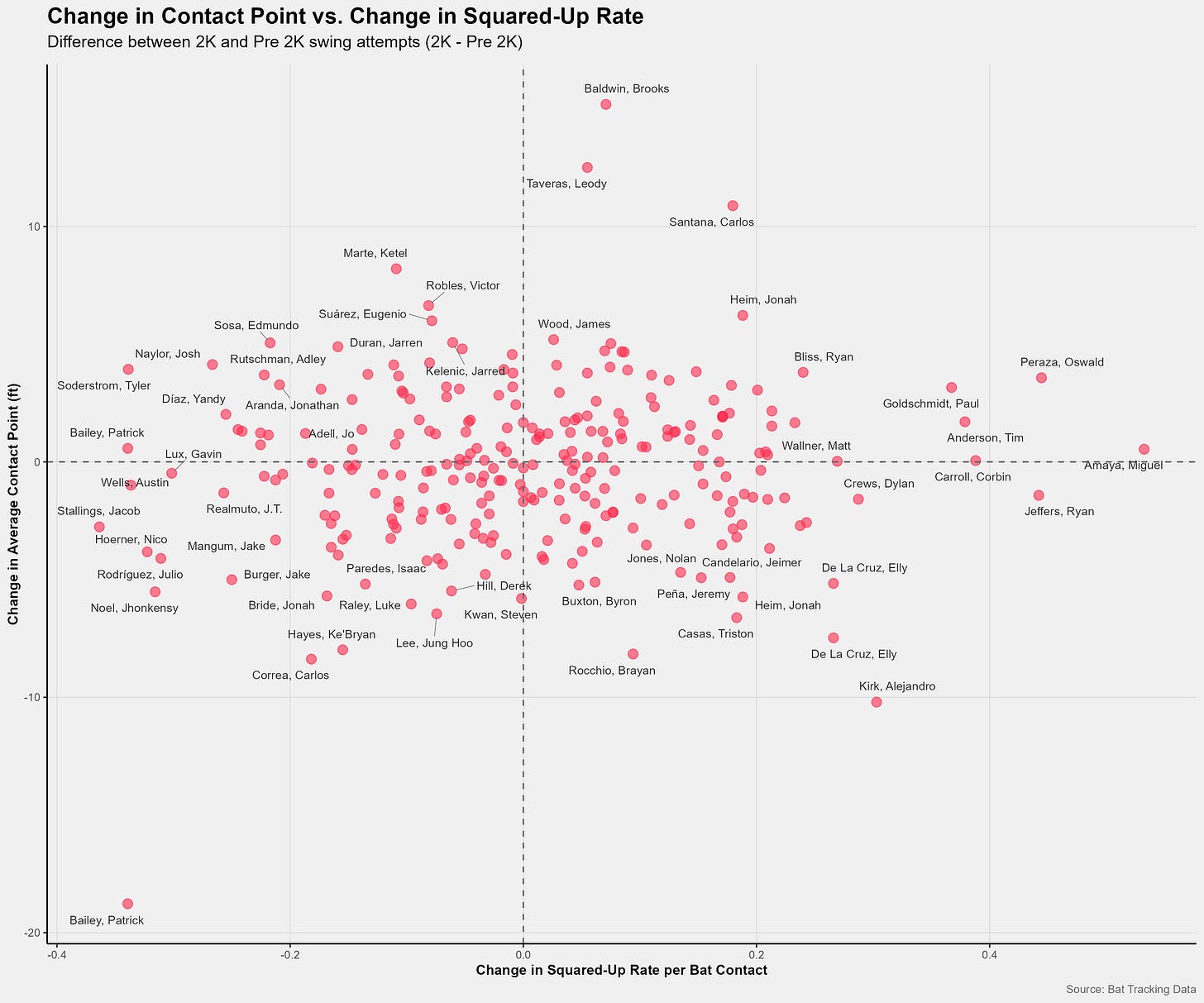 Once again, we don’t see a significant change in how players square up pitches across different count situations, even as bat speed fluctuates. The data doesn’t offer much signal here. Players who maintain a consistent Squared Up Rate tend to also keep a similar contact point. This suggests that hitters who aren't adjusting their approach to see the ball deeper are, in fact, doing exactly what they practice daily. However, we do observe some players making adjustments upward, which indicates that many are struggling to adapt their contact point as much as they’d like—or as much as they believe they can. In fact, some players in the bottom-left quadrant show a decline in their ability to square up pitches, even as they try to adjust to deeper contact points. I like to think of the top right corner here as players who are effectively producing at a high level and also going to get the ball further out front.